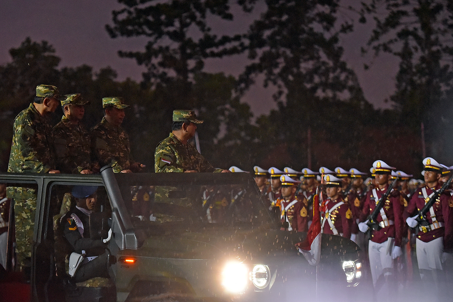 Pada Maung pertama, Presiden Prabowo didampingi Panglima TNI Jenderal Agus Subiyanto, Kapolri Jenderal Listyo Sigit Prabowo, dan Menteri Pertahanan Sjafrie Sjamsoeddin. Maung kedua diisi oleh Wakil Presiden Gibran Rakabuming di bagian depan, dengan tiga Kepala Staf berada di belakangnya.
