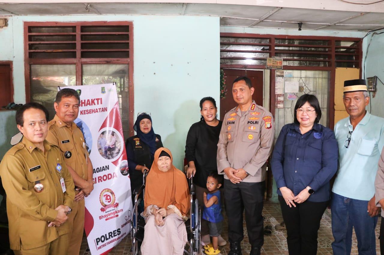 Kota Tangerang (Wowtangerang.com) – Kepala Kepolisian Resor Metro Tangerang Kota, Kombes Pol Zain Dwi Nugroho, didampingi Kadinsos Kota Tangerang Mulyadi, Kapolsek Tangerang AKP Suyatno dan Kasi Humas AKP Prapto Lasono menyerahkan bantuan kursi roda dan bantuan sosial berupa paket sembako kepada 3 (tiga) orang warga di Kelurahan Buaran Indah, Kecamatan Tangerang, Kota Tangerang. Selasa, (3/6/2025).